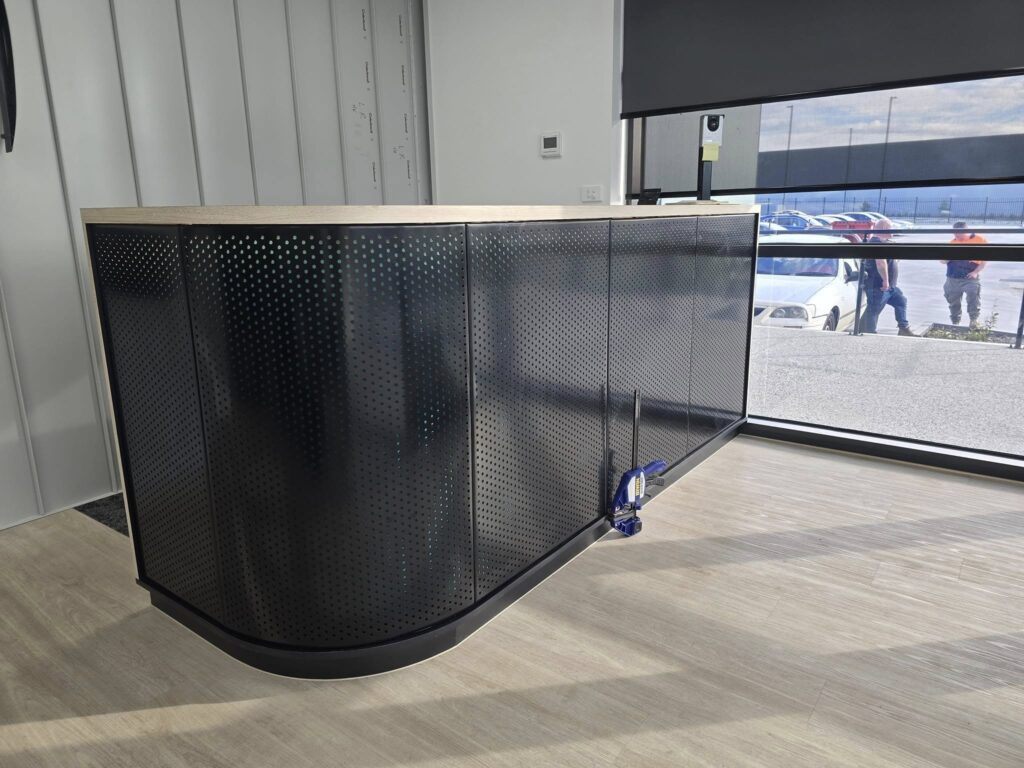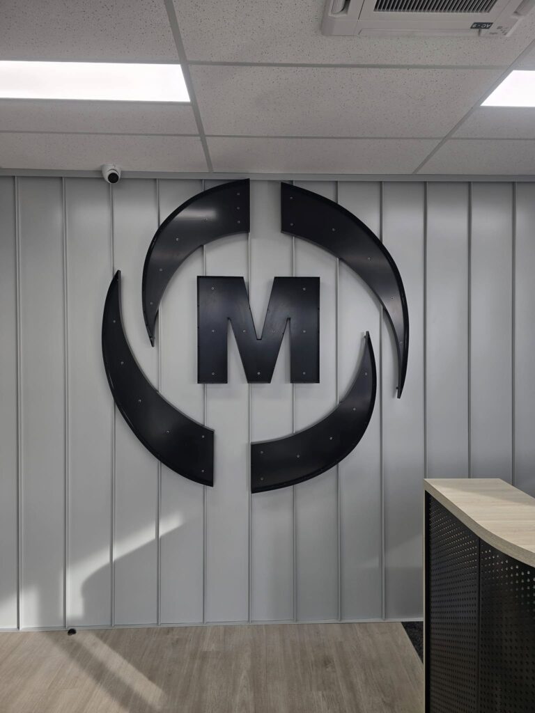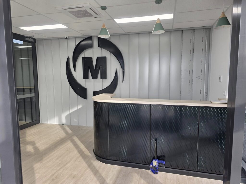 This project included the fabrication and installation of perforated panels for cladding, signage, and a custom reception desk. The works were completed using our Trimble total station, ensuring a high level of precision and accuracy throughout the installation process. The signage was finished with a moss infill, creating a distinctive and visually striking feature.